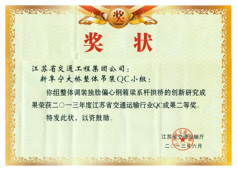 江苏省交通运输行业QC成果二等奖(2013年度)