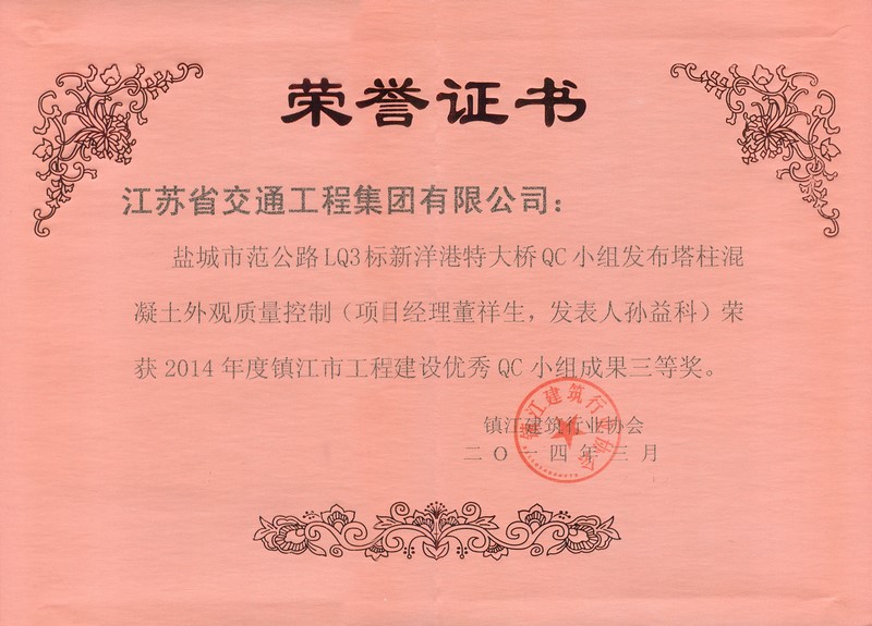 镇江市工程建设优秀QC小组成果三等奖(2014年度)