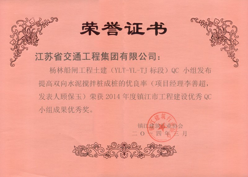 镇江市工程建设优秀QC小组成果优秀奖(2014年度)