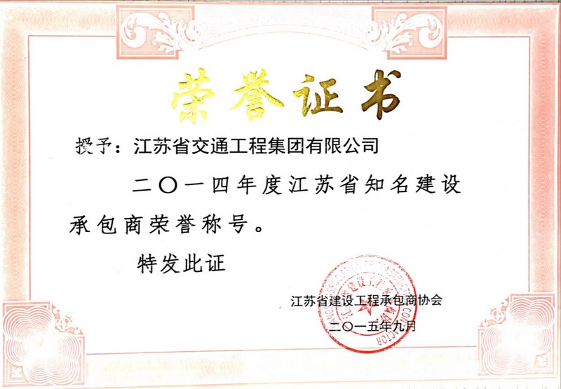 江苏省知名建设承包商荣誉称号(2014年度)