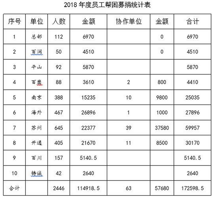 本次年度募捐活动共有2446名员工参与,募集捐款114918.5元,百崮公司、南京分公司、海外分公司、苏州分公司、开通开通等五个分、子公司的63家协作单位参与募捐,募集资金57680元。(刘施李)