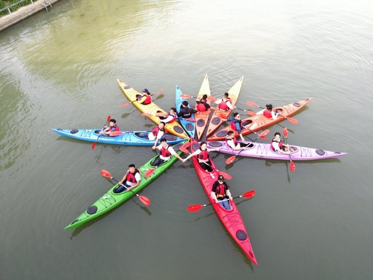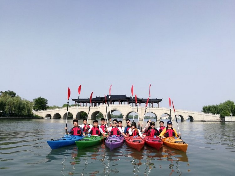 下午青年团员来到苏州金鸡湖李公堤水域穿戴救生衣进行皮筏艇路上演练。在掌握划船技巧后,采用双人皮筏艇,两人一组,先在固定水域磨合练习,之后船队出发,入腾龙桥,经湖心亭,过如意桥进入小金鸡湖,最后驶出凌云桥回到码头。
