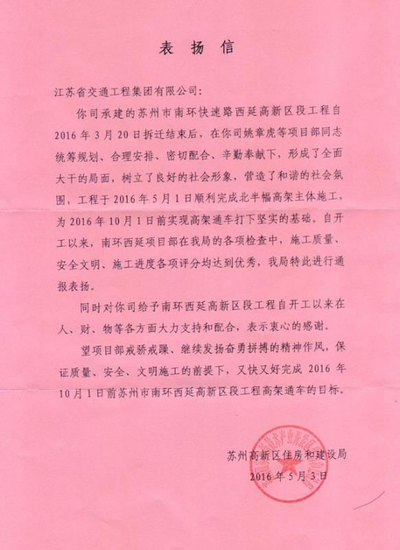 日前,集团公司收到一份由苏州国家高新技术产业开发区住房和建设局发出的表扬信。信中对苏州分公司苏州市南环快速路西延高新区段项目部能统筹规划、合理安排、密切配合、辛勤奉献,顺利于5月1日完成北半幅高架主体施工进行了通报表扬。
