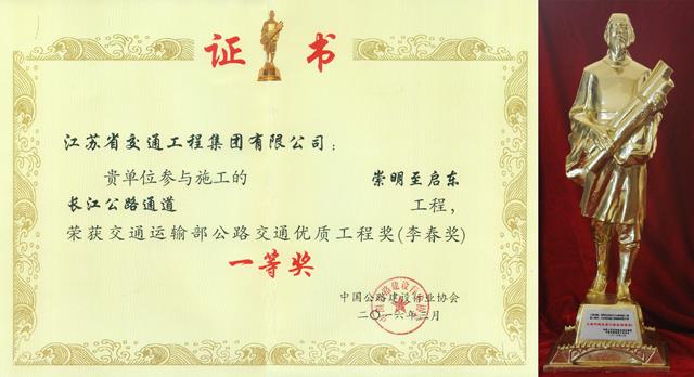 在日前召开的2014~2015公路交通优质工程“李春奖”颁奖典礼暨“弘扬工匠精神打造品质工程”高峰论坛上,由集团公司参建的上海崇明至启东长江公路通道工程,获得2014~2015年度公路交通优质工程“李春奖”一等奖,李炎军获得优秀项目总工程师称号。