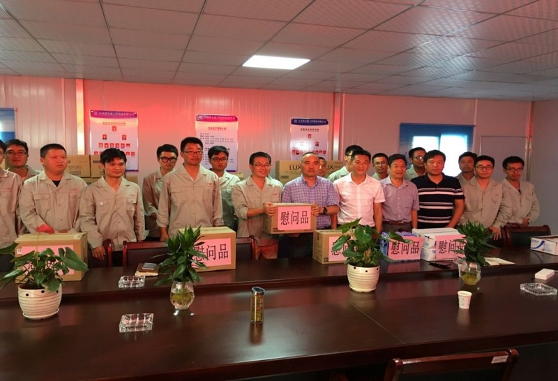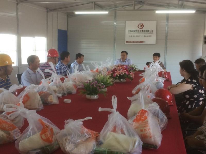 7月21日上午,集团公司总裁龚万斌、财务总监张群、机关工会主席倪彦琴一行,带着150份的防暑降温慰问品来到集团公司总部暨生产基地建设项目部,慰问坚守岗位,辛勤工作的一线职工。在项目部会议室,龚万斌总裁和一线工人代表们进行交流,亲切的说到:“这次我们代表集团公司带来了一个心意、一个愿望,一个心意是希望大家平平安安度过夏天;一个愿望是祝愿大家健健康康干活!”并叮嘱项目部合理安排工作时间、避开高温时段、缩短职工露天连续作业时间,保证职工的身体健康。