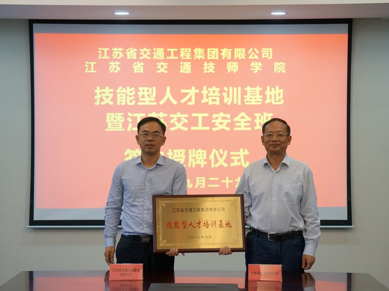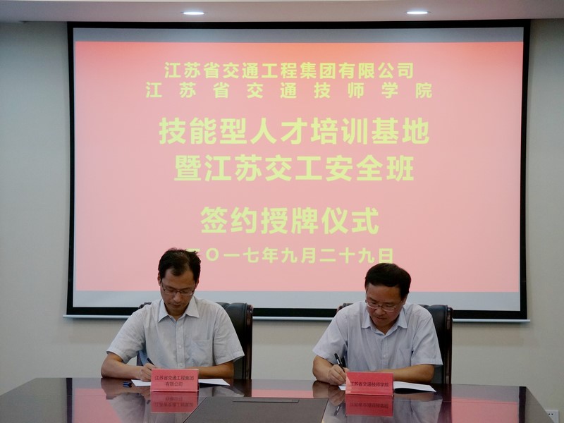 9月29日下午,集团公司与江苏省交通技师学院技能型人才培训基地暨“江苏交工安全班”签约授牌仪式在江苏省交通技师学院举行。集团公司董事长张晓宇、总裁龚万斌出席仪式,并签署合作协议和授牌。