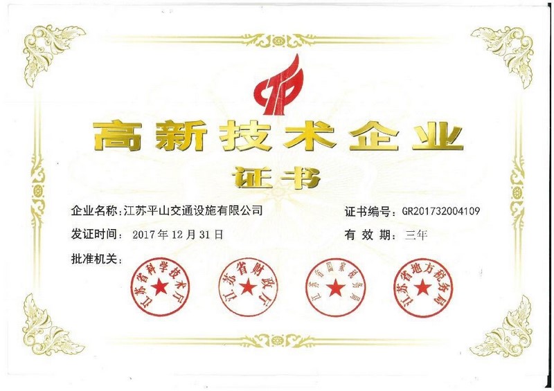 江苏平山交通设施有限公司喜获省级高新技术企业认定