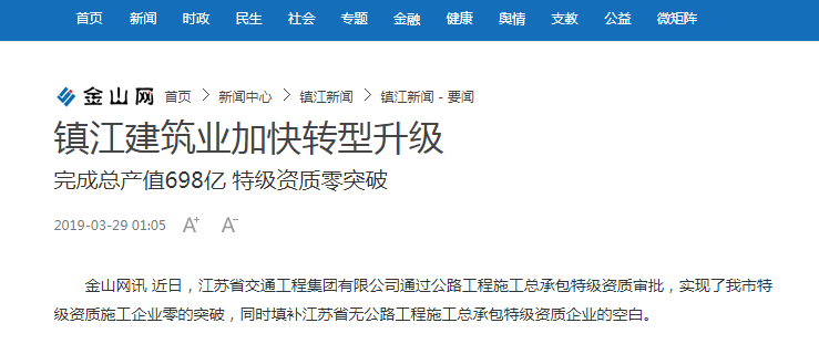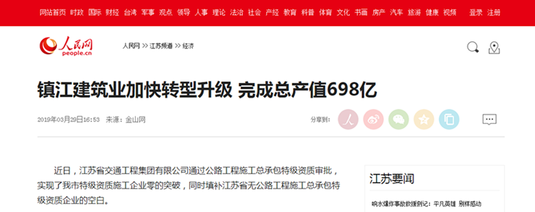 镇江金山网刊文/人民网转载:赞誉江苏交工成为镇江建筑业转型发展的“领头雁”