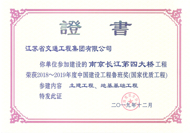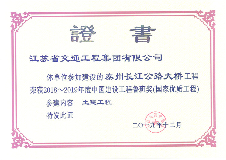 12月9日,国家优质工程奖颁奖大会在北京国家会议中心举行。由集团公司参建的南京长江第四大桥、泰州长江公路大桥双双荣获“2018~2019年度中国建设工程鲁班奖”。