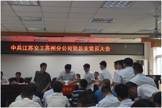 6月29日下午,在雄壮的“国际歌”音乐声中,江苏百川航务工程有限公司党支部换届选举党员大会圆满结束,新一届支部委员履新上任。至此,历时1个月,集团公司3家党总支、6个党支部均通过组织召开党员大会,按照严格的规范流程,顺利完成换届改选工作。