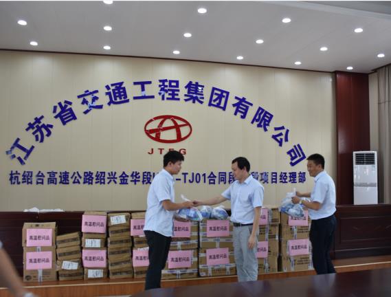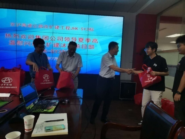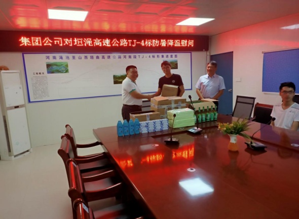 在垣渑高速公路TJ-4标,巫亚明副总裁对奋战在垣渑高速公路施工生产一线建设者进行夏季慰问,并为大家送上防暑降温用品。