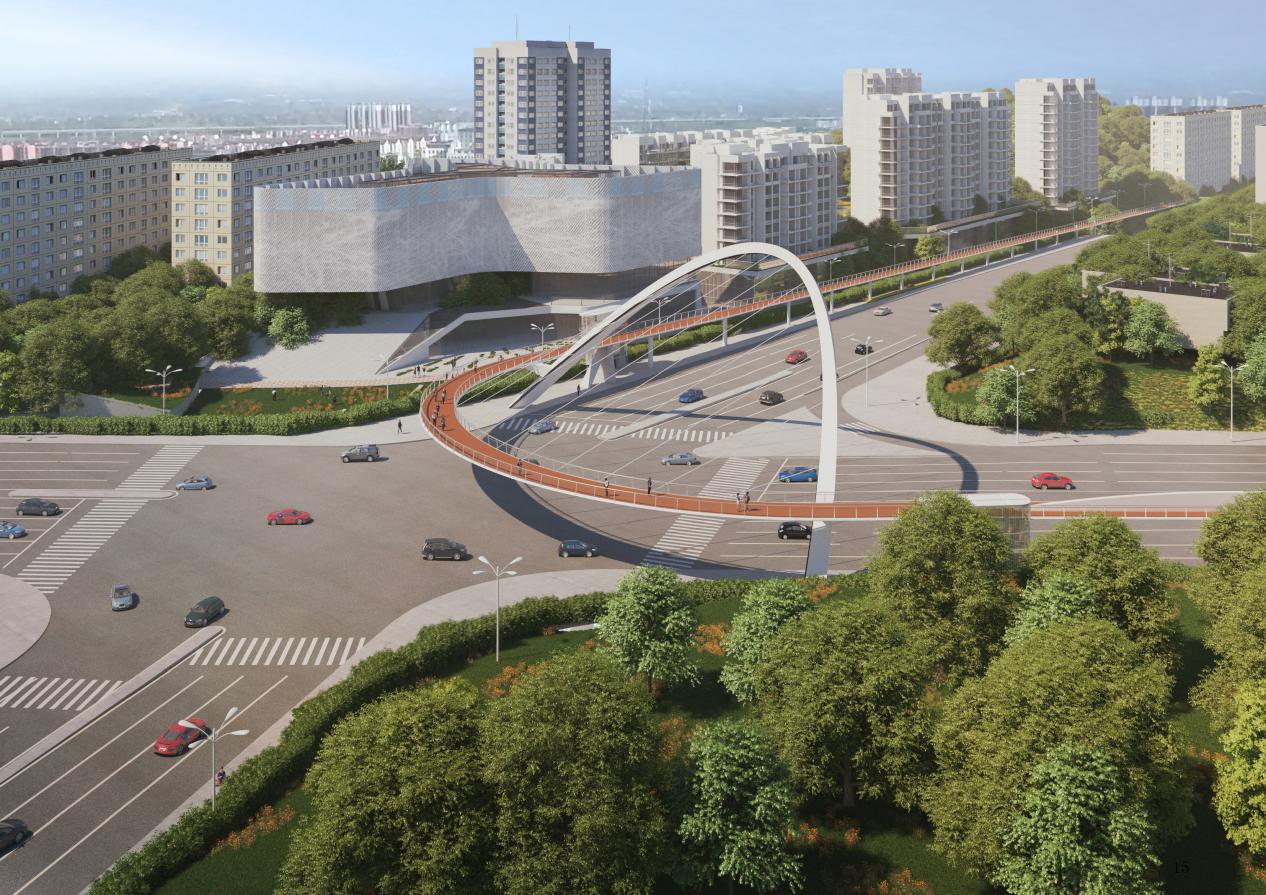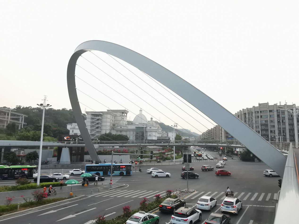 节点三“园山桥”为单边支撑空间拱桥,拱桥采用单面吊杆,钢箱梁总宽4.4米,长约130米,单跨90米,拱高29米,钢拱肋与主梁之间通过13根直径50毫米的不锈钢吊索进行连接,宛如各自后仰的两人,通过互拉双手保持平衡,令人不得不惊叹结构之美妙。