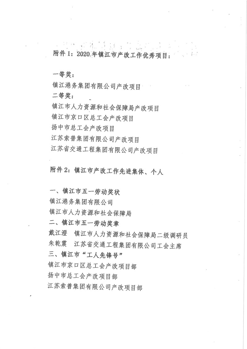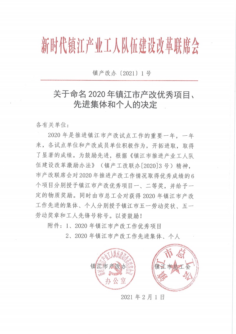 2月1日,镇江市总工会发文命名2020年镇江市产改优秀项目、先进集体和个人。集团公司被评为产改优秀项目二等奖。集团公司工会主席朱乾震被评为产改工作先进个人,并被授予“镇江市五一劳动奖章”。