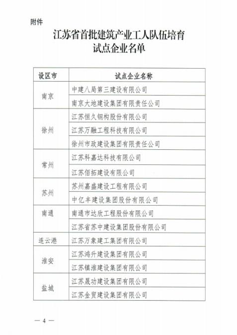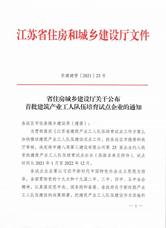 近日,江苏省住房和城乡建设厅下发文件,发布25家企业为全省首批建筑产业工人队伍培育试点企业,试点时间从今年1月至2022年12月。江苏交工集团位列其中。