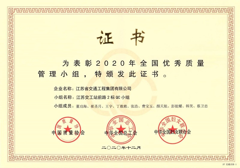 4月15日至16日,全国交通质量年会在合肥召开,集团公司站前路2标QC小组被中国质量协会、中华全国总工会、中华全国妇女联合会联合授予“2020年度全国优秀质量管理小组”称号。