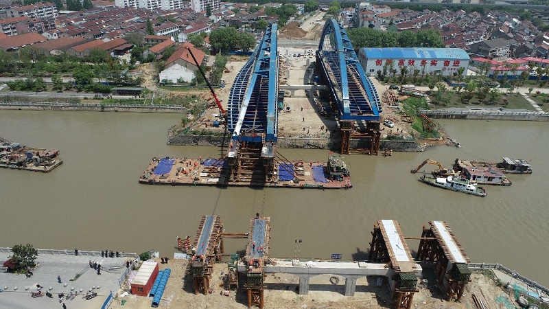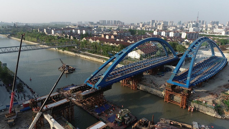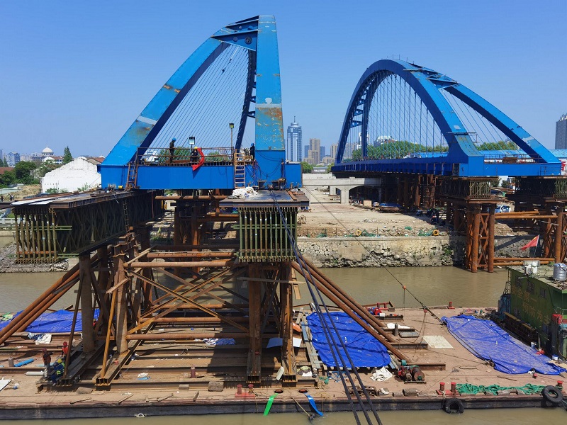 据了解,云阳桥主桥为斜靠式系杆拱,长110米,计算跨径108米,主桥钢结构半幅浮拖重量1400吨。钢桥浮拖过河主要是利用浮拖船的浮力平衡钢梁的重力,借助大运河潮水的托举,并通过拖拽装置对半幅钢梁桥进行整体稳步拖拽,直至半幅钢桥整体在对岸落梁。为完成本次施工任务,项目部在河东岸设置拼装平台,用于完成钢桥拼装。同时架设拖拽轨道,采用2台LSD200D-300型连续千斤顶(该顶单行程30cm,行程时间为120秒),通过浮托体系向前移动就位。拖拽主要由支架、滑道及拖拽装置、浮托船、八字锚和安装落梁系统组成。本次浮拖安装施工主要分6大步骤,具体为:浮拖就位、始发水陆支架对接、系杆拱上船、半幅系杆拱整体拖拽施工、接收水陆支架对接、系杆拱就位。