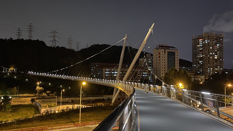 据悉,和美桥是厦门健康山海步道景观提升工程七座节点桥梁之一,为独塔单侧悬挂曲线悬索桥,采用大跨度单边支承V塔悬索桥的结构体系,桥面宽度3.8米,钢箱总宽4.4米,长约230米,塔高50米。桥塔与主梁通过2根140毫米主缆,1根140毫米中间连接索,4根背索以及34根悬挂索形成自平衡漂浮体系,V塔与承台基础采用球形支座进行连接。该桥梁主跨216.7米,新材料、新工艺、新技术应用较多,受力体系转换复杂,施工难度大,为目前世界上同类型桥梁主跨长度及施工难度之最。施工过程中,集团公司开路人秉承着“绿色施工”“文明施工”“安全施工”的理念,相继克服了疫情、台风等不利影响,攻克了技术难题,以强大的实力、卓越的技术,为城市及市民交上了一份满意的答卷,让和美桥成为闪耀厦门、闪耀中国乃至闪耀世界的璀璨明珠。