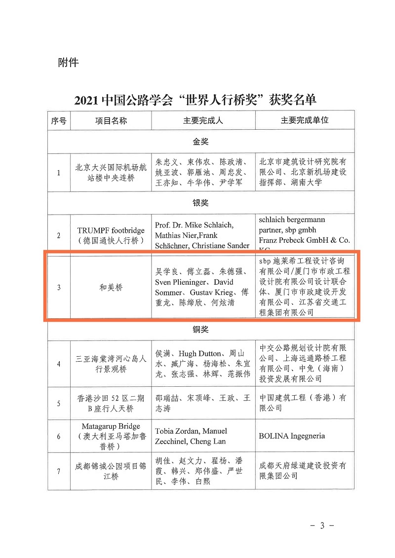 5月25日,中国公路学会公布了《关于表彰2021中国公路学会“世界人行桥奖”的决定》,集团公司承建的厦门和美桥荣获“世界人行桥奖”银奖,充分彰显了集团公司卓越的建设水平。