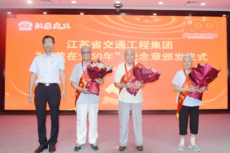 向“光荣在党50年”的老党员代表集中颁发纪念章是本次会议的一项重要议程。大会特地将集团离休支部3名荣获“光荣在党50年”纪念章的老党员代表邀请到了会议现场。据了解,今年集团公司共有20名党龄达到50年以上的老党员荣获纪念章。在颁发仪式上,集团党委书记、董事长、总裁张晓宇亲手为3名老党员代表佩戴上光彩熠熠的纪念章,并为每人送上了一捧象征敬仰和礼赞的鲜花。举行纪念章集中颁发仪式,既是对伟大的中国共产党建党100周年的热烈庆祝,也是对老党员的一次集体致敬和礼赞,更是对江苏交工全体党员一次深刻的党性教育。