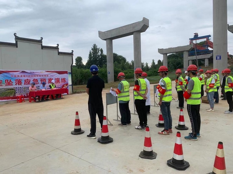 目前,许信8标施工现场正处立柱、盖梁以及桥面系施工高峰期,多处施工点位涉及到高处作业。为增强现场施工人员的安全生产意识,提高安全事故应急救援能力,许信8标项目部举行了“高处坠落事故”应急救援预案演练。