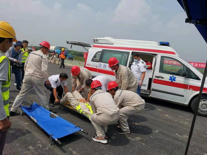 在项目经理王作恒的带领下,项目部各部门各司其职,做好演练的各项准备工作。6月19日,随着演练总指挥王作恒一声令下,许信8标“高处坠落应急演练”正式开始。此次演练模拟了在董庄大桥2#墩架梁施工现场,1名作业人员不慎从高空坠落,腿部受伤,头部出血,处于昏迷状态的安全事故情景。“发现”险情后,现场专职安全员立即上报项目经理部应急指挥中心,并立即拨打120急救电话。项目部立即启动应急预案,现场救护组、后勤供应组、“120”救护车等陆续到达现场,将坠落人员送上救护车送往医院治疗,排除险情。随后,经事故调查组迅速查明原因,全员通报事故原因,吸取经验教训后,演练结束。此次演练立足实际、环节紧凑、模拟逼真,较为全面真实展现了应急预案的响应机制和处理程序,检验了许信8标项目部高处坠落应急预案的可行性和科学性。