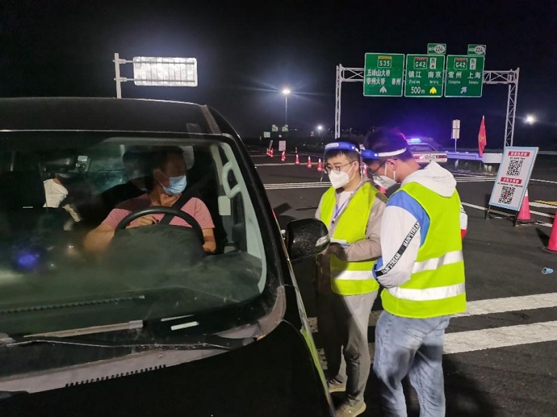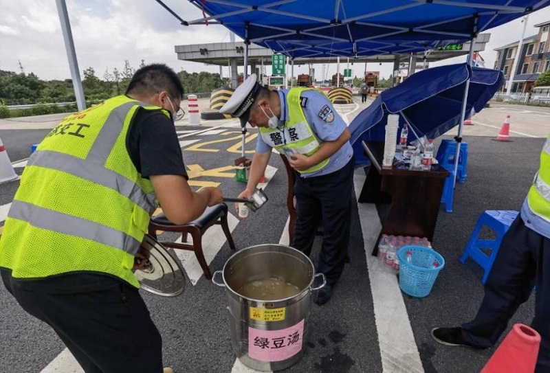 8月5日,夏日炎炎,防疫工作人员顶着烈日站在丹阳新区收费站“查验点”,开展各项防疫相关工作。丹阳云阳大桥项目部负责人杨志忠带队赶赴收费站表示慰问,并将一份份提前准备好的绿豆汤送到防疫人员的手中。