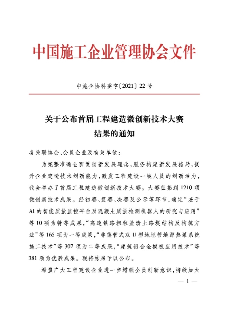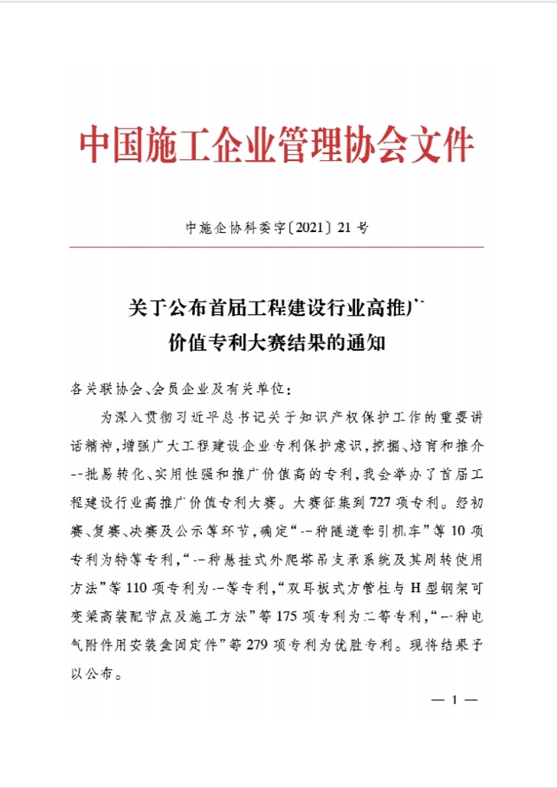 日前,中国施工企业管理协会发布了“首届工程建造微创新技术大赛、首届工程建设行业高推广价值专利大赛结果”,南京分公司丹阳市云阳大桥“增加临时对拉装置拆除系杆拱桥施工工艺”和“系杆拱桥增加临时对拉装置拆除方法”分获“一等奖”“优胜奖”,彰显了集团公司卓越的建设水平。