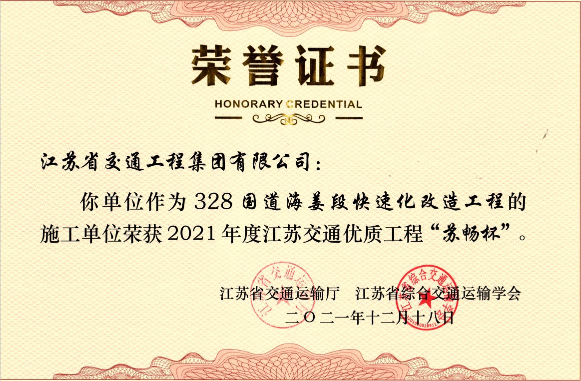 江苏交通优质工程“苏畅杯”是服务江苏交通强省战略的综合交通领域工程建设最高奖,也是全省交通工程品高质优的代表,该奖项评选工作由省交通运输厅、省综合交通运输学会联合开展。