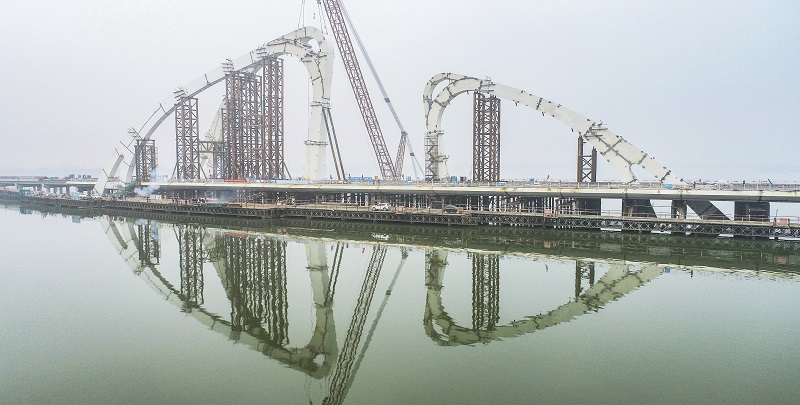 1月10日,江苏淮安,白马湖大桥钢拱塔合龙。