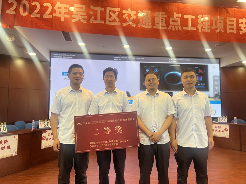 6月21日,苏州市吴江区交通工程建设处和质监站联合举办了区交通重点工程项目安全知识竞赛,江陵路2标项目部作为区重点交通工程项目之一受邀参赛。经过四个环节的激烈比拼和角逐,项目部三名参赛选手充分发扬团队合作精神,紧密配合,凭借扎实的安全管理知识和技能,在参赛的11支代表队中成功获得第二名的优异成绩。