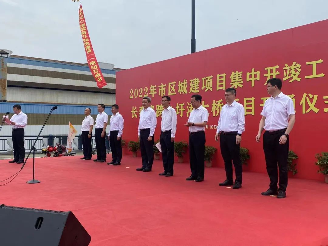 7月16日上午8时许,南通市2022年市区城建项目集中开竣工暨长泰路跨九圩港大桥开通仪式在长泰路跨九圩港大桥现场举行。本次集中开竣工城建项目共20项,总投资约90亿元。南通市委副书记、市长吴新明出席活动,并宣布工程开竣工,副市长童剑对推进城建项目建设提出明确要求,副市长李建民主持仪式。集团公司总裁王纪源、副总裁傅玉罗出席开通仪式。