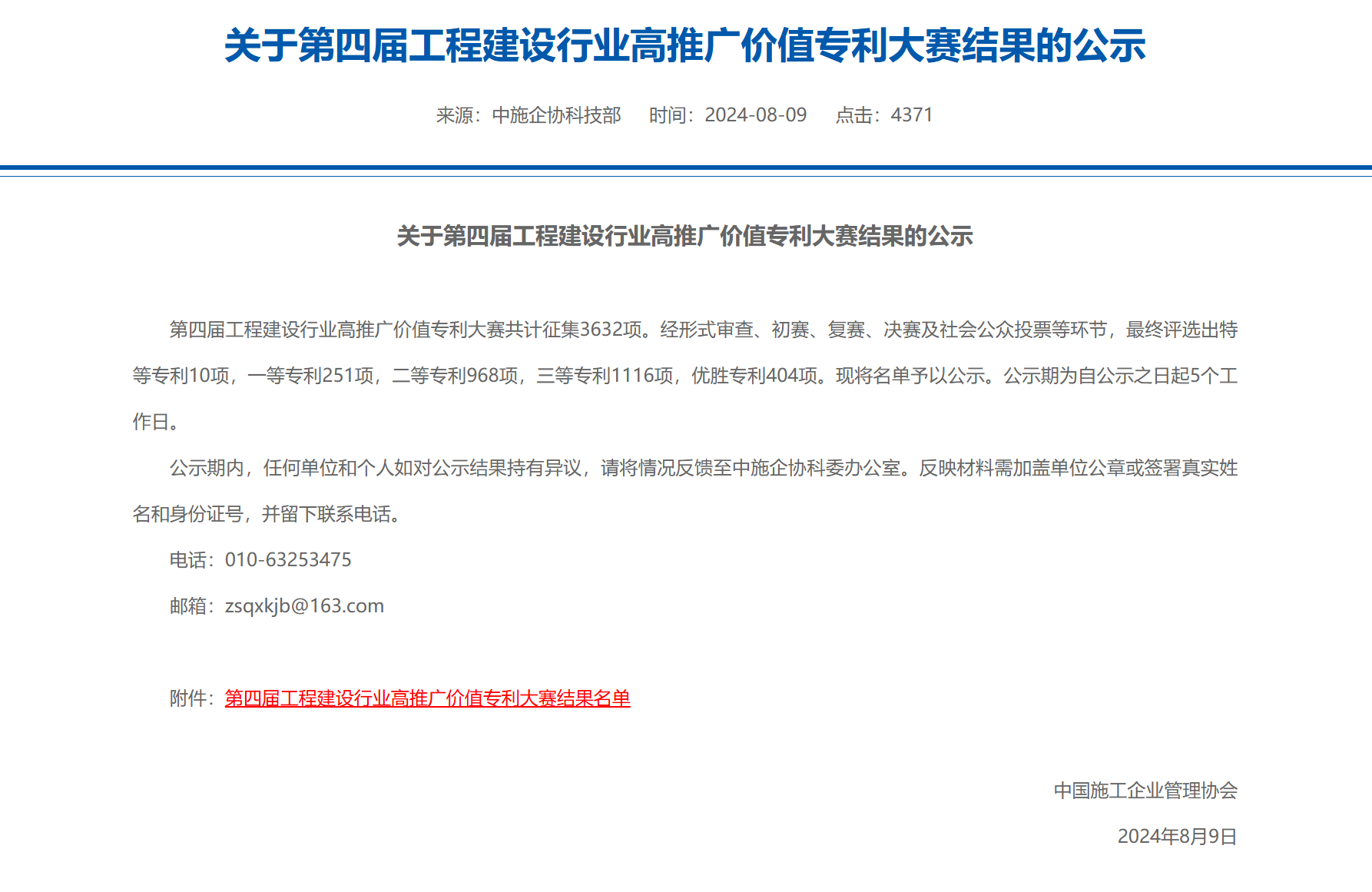 平山公司在第四届工程建设行业高推广价值专利大赛 荣获佳绩