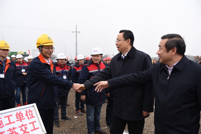 上图为蓝绍敏副省长看望慰问工程建设者并与张晓宇董事长亲切握手