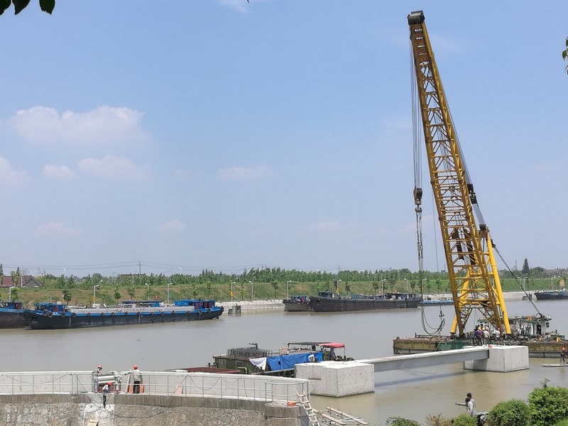 2017年7月20日上午,泰州市引江河高港船闸首片人行桥板梁开始吊装施工。