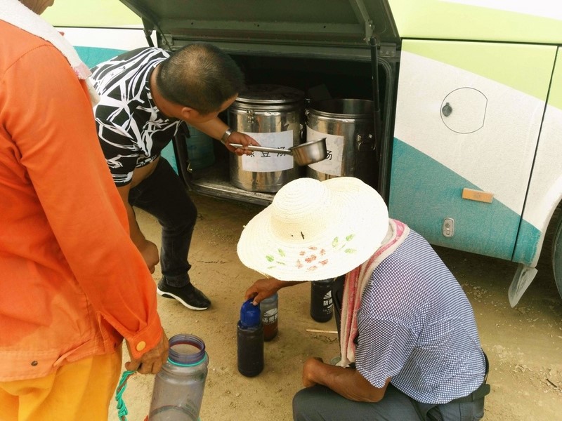 图为将绿豆汤等防暑降温饮品送至施工生产一线