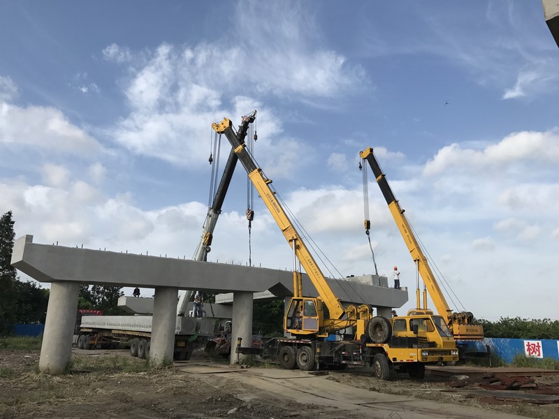 为做好此次板梁安装工作,项目部提前做好相关准备,他们对首先做好板梁出厂前的质量检查、又仔细确认了运梁路线,并安排好墩柱间运梁便道钢板铺设、支座垫石上测量放样等程序。从巴城预制场出发,每辆平板车运两片梁,整个吊装采用一台50t吊车和两台25t吊车进行安装。