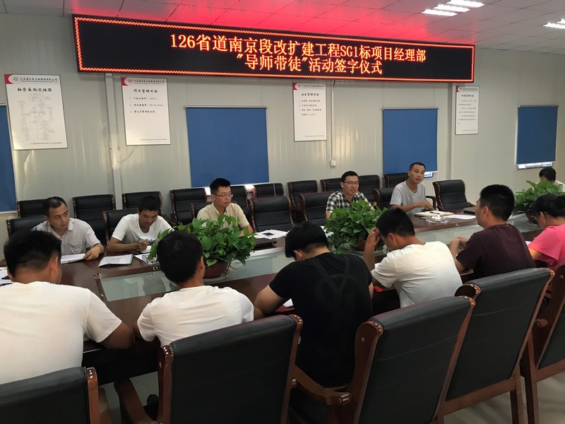 8月24日,南京分公司126省道南京段改扩建工程SG1标项目部举行“导师带徒”合同签订仪式,4对共8名新老员工正式确立师徒关系。