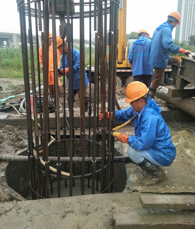 走近可以清晰的看出,那些忙碌的身影正是桩基队的施工人员,在进行钢筋笼的安装工作。雨天施工比较辛苦,难度也比平常施工要大的多。现场钢筋工陈师傅说:“最近一个星期都在下雨,每次下钢筋笼都要3个多小时,有时正在工作着,雨就下了下来,现场有8台钻机都在运行着,下钢筋笼的任务丝毫不能懈怠。”边说着,陈师傅边投身到工作中去了。