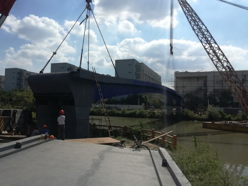 健雄职业技术学院位于苏州太仓科教新城,盐铁塘自北向南穿过健雄学院,将校园分为东、西两个校区,校园内一直没有跨越盐铁塘的桥梁,师生来往两校区须绕行整个盐铁塘,费时费力,交通极为不便。因此,学院决定新建一座跨越盐铁塘的人行天桥钢箱梁,为广大师生提供更多便利。