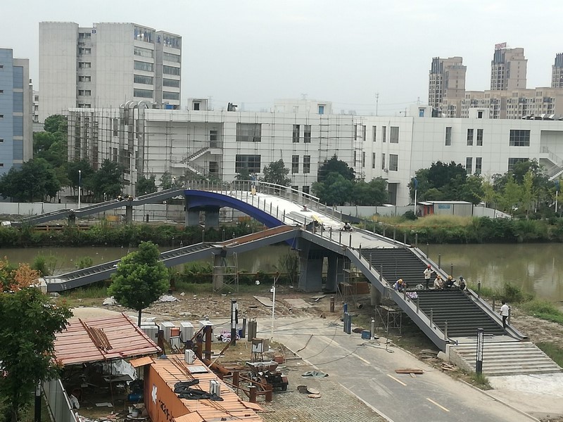 9月1日人行天桥主梁制作完成,9月7日钢箱梁合拢,9月13日完成合拢缝焊接,9月15日完成现场面漆涂装,9月16日采用120吨浮吊加200吨汽车吊开始吊装作业,9月23日完成4座梯道桥吊装。目前主桥已经焊接完成,梯道桥正在焊接之中,桥面混凝土铺装已经完成,正在进行栏杆等附属设施安装工作。 (宗秋斌)