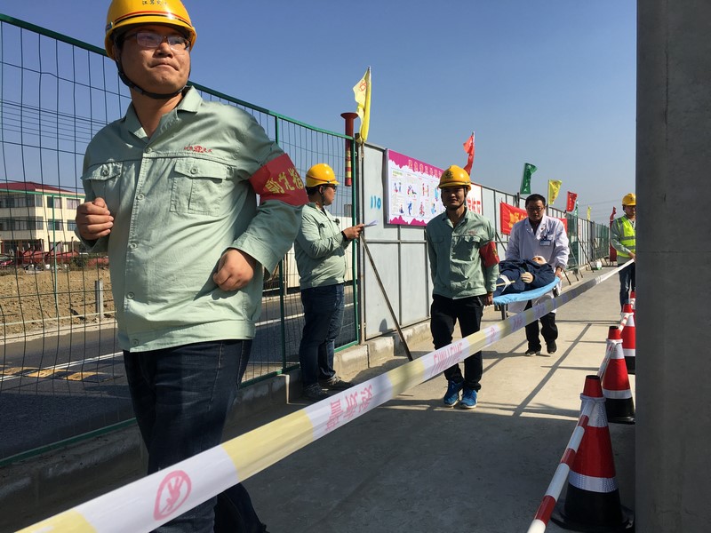 随着项目经理兼演练总指挥陈华东一声令下,演练正式开始,各环节按照预案设定有条不紊推进。现场人员发现有人从高处坠落,巡查人员第一时间向办公室汇报,办公室主任立即向执行总指挥王强汇报事故的具体情况,王强随即安排各抢险救援组赶往现场,直至安排伤者送往医院,宣布警戒解除。演练结束后,相关人员及时对演练过程以及相关经验进行了总结、交流。