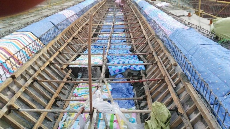 图为开通公司5标新浇箱梁采取棉被覆盖保温