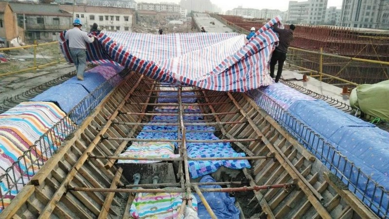 淮安市内环高架开通公司5标新浇箱梁穿上“防寒服”