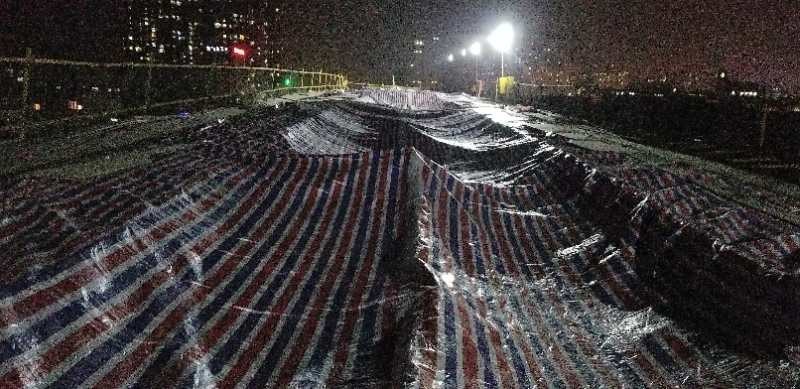 图为开通公司5标新浇箱梁采取棉被、彩条布进行覆盖保温
