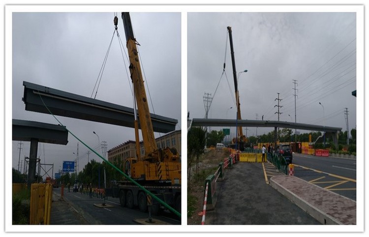 张家港市城北职教园人行天桥钢箱梁顺利吊装