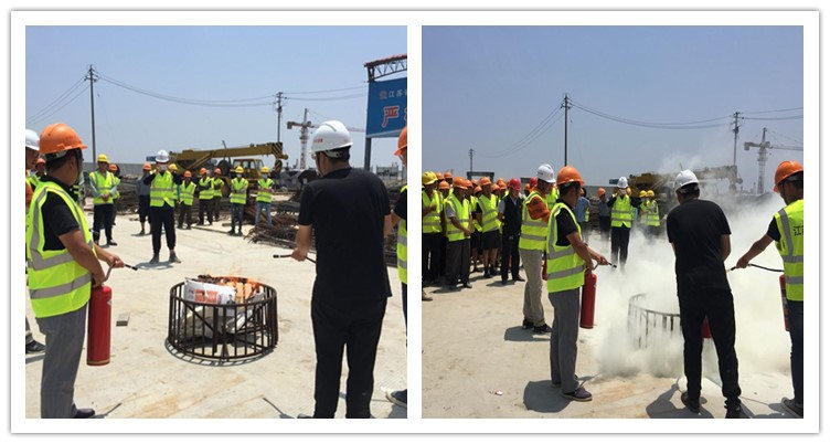 6月19日中午,杭州湾新区玉海西路项目组织全体管理人员和各家施工队伍开展了消防演练活动。现场,项目部安全科黄磊进行了关于消防隐患预防的宣传工作,并介绍和示范了灭火器使用。