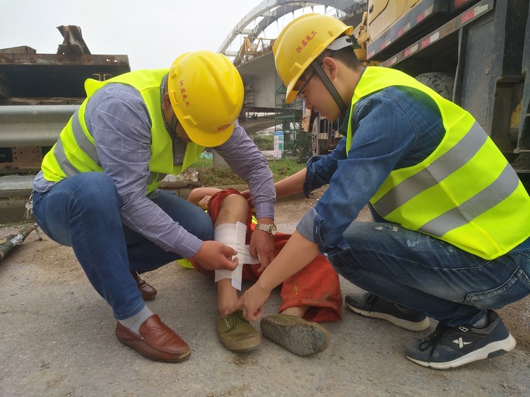 按照演练计划,在下午16:30,现场模拟工人在指挥吊车倒车时,被过往车辆碰伤倒地,造成腿部受伤,情况紧急。此时,项目部值班人员发现情况后,第一时间保护好受伤人员防止二次伤害,并拨打了120急救中心,然后通知了项目经理,对相关的安全救援活动进行开展。