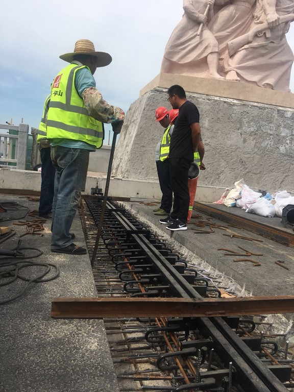 由于长江大桥在结构和尺寸上与以前结构设计大不相同,再加上多年来老桥伸缩缝维修频繁,因此此次伸缩缝的设计要求颇高。平山公司作为省内伸缩缝行业的排头兵,在伸缩缝的设计、制造、安装施工等方面有着多年的施工经验,中标后,公司多次派人现场勘察,设计了针对长江大桥桥面情况的特制版伸缩缝。该伸缩缝中间是型钢,两侧是同色高强度混凝土,能够承载大的荷载冲击而不变形,结构也更能适应老的桥面和梁体的结构深度,建成后的伸缩缝基本路面齐平,行车时非常平稳,不会有跳车、颠簸的感觉。