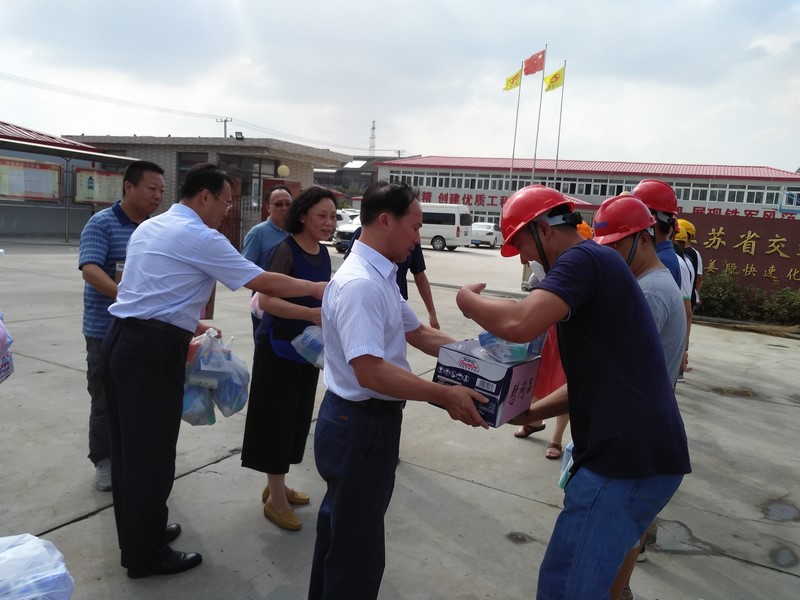 7月21日下午,泰州市交通局局长李龙根带领一行人员莅临328国道海姜段快速化改造工程2标项目部,慰问高温天气依然奋战在一线的工程建设人员,并亲自送上了毛巾、矿泉水、花露水等防暑降温物品。交通局总工程师刘婷、公路管理处处长周进华参加此次活动。