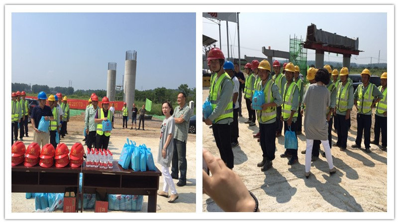 7月30日上午,南京市六合区总工会副主席任家芳一行人来到六合区农村公路2017TD-A10标项陈大桥施工现场,慰问在酷暑中坚守岗位、辛勤劳动的一线职工,为他们送去防暑降温物品。